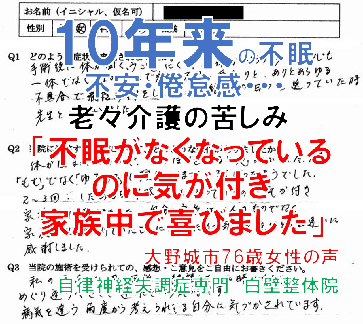 不眠症、身体表現性障害(全身の重さ・こわばり、口の痛み)、うつ病(不安・焦燥感・倦怠感)、耳鳴り、大野城、中島具子2(文字)